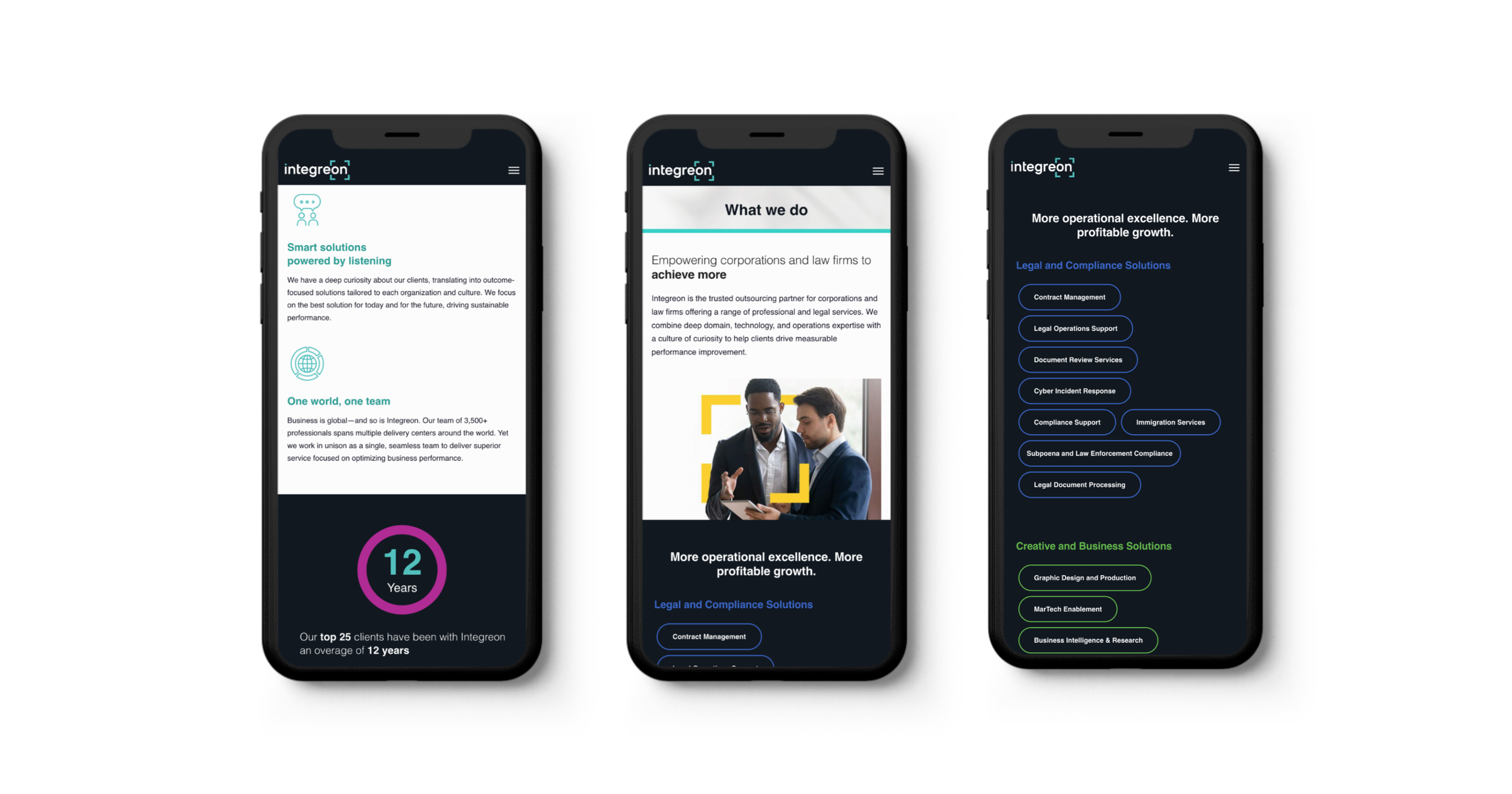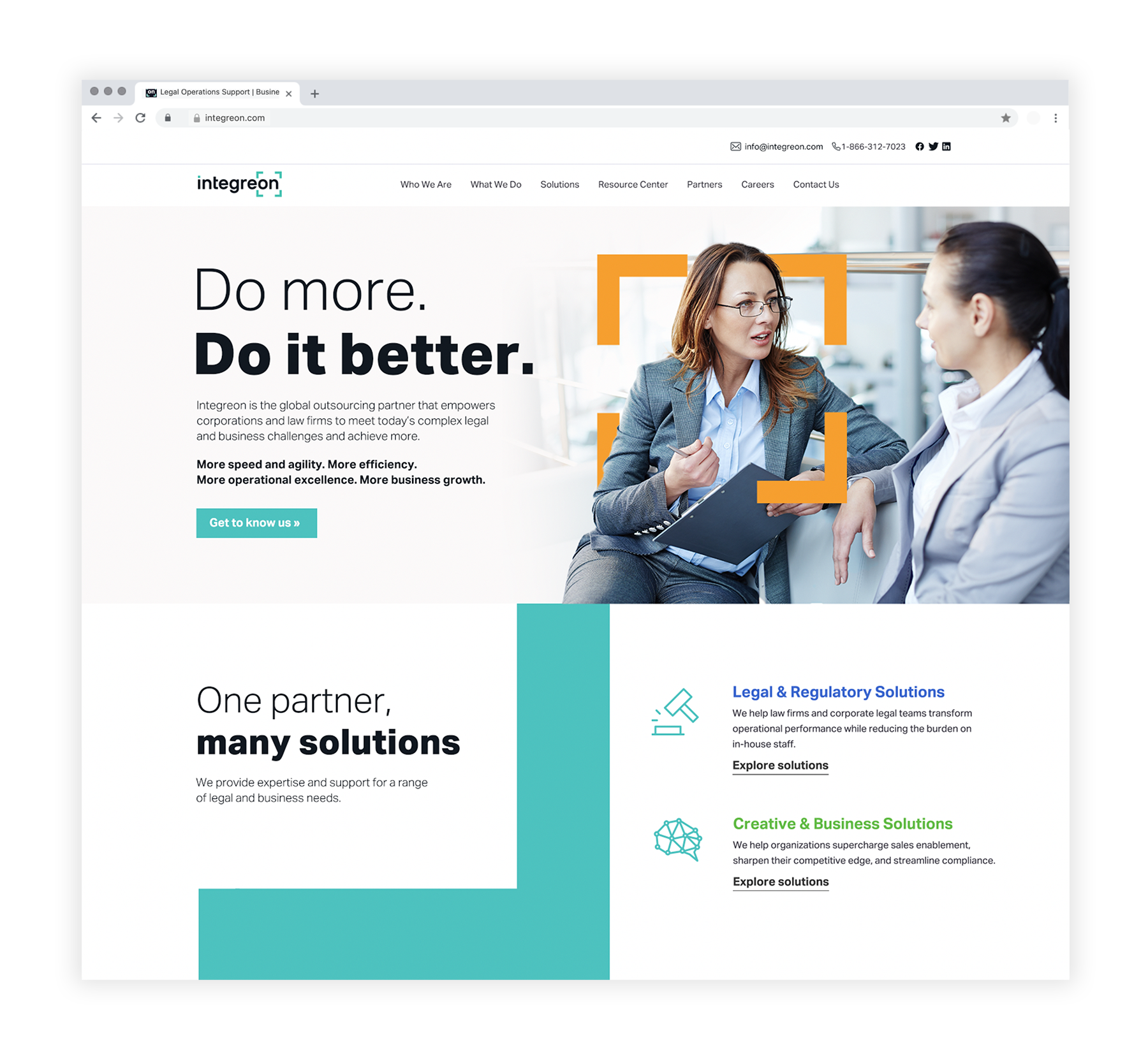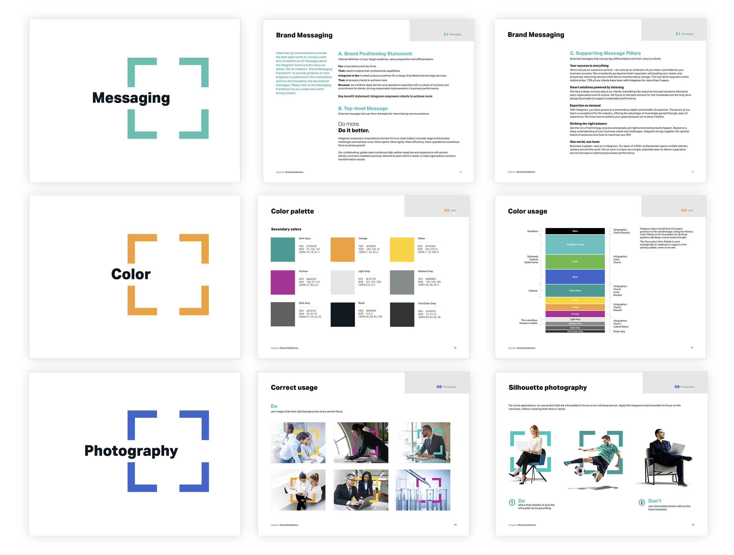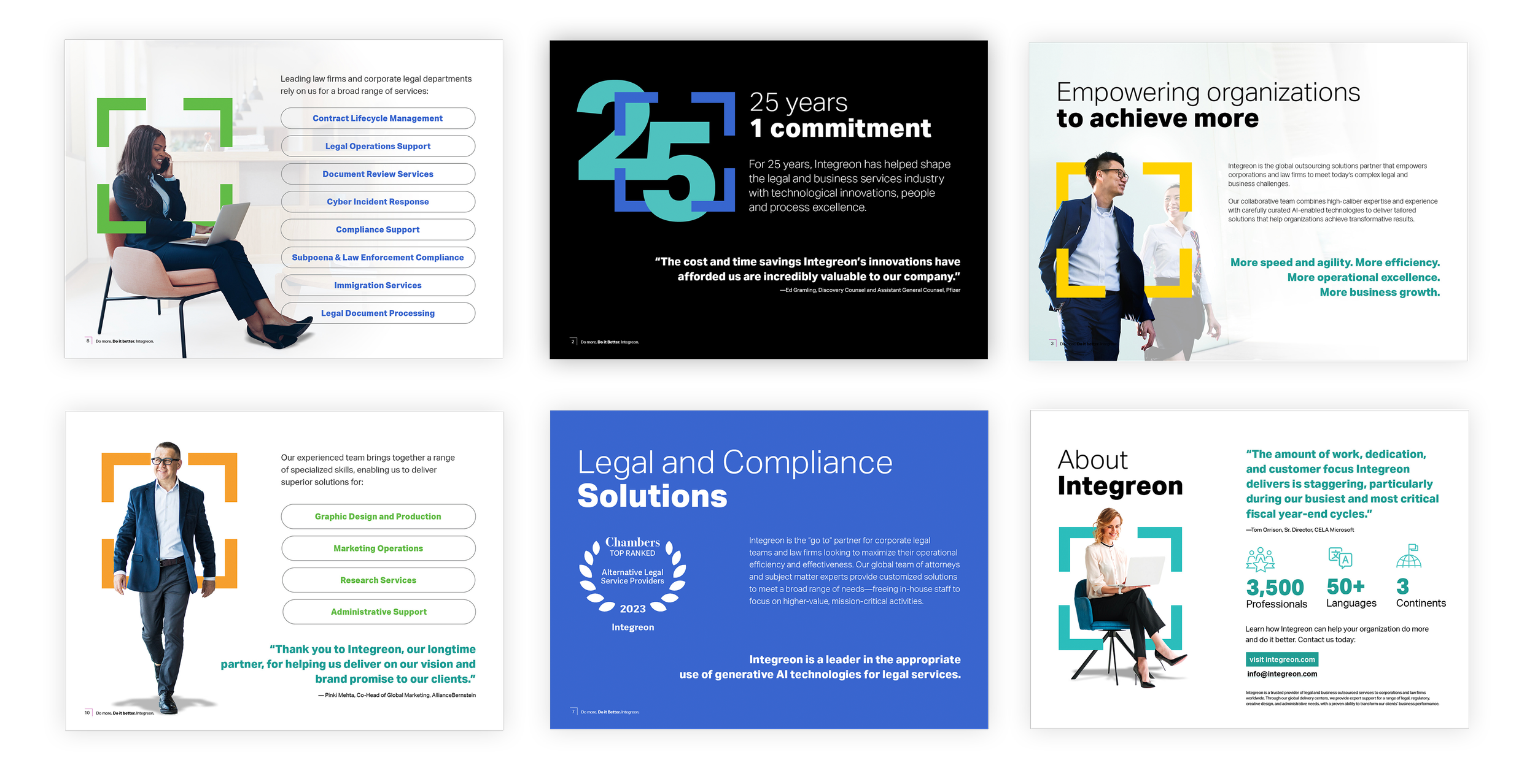 Rebranded all facets of Integreon, crafting a bold new visual identity through a vibrant color palette and comprehensive brand guidelines. These encompassed color usage, an expanded photo library, custom icons, sell sheets, online brochures, and a fully refreshed website. Directed the development and implementation of brand pillars in alignment with the company's mission, incorporating their longstanding logo with enhanced photo and digital design strategies. This revitalized branding was seamlessly integrated across all company collateral, including thought leadership materials, print communications, digital assets, website, and social media channels.